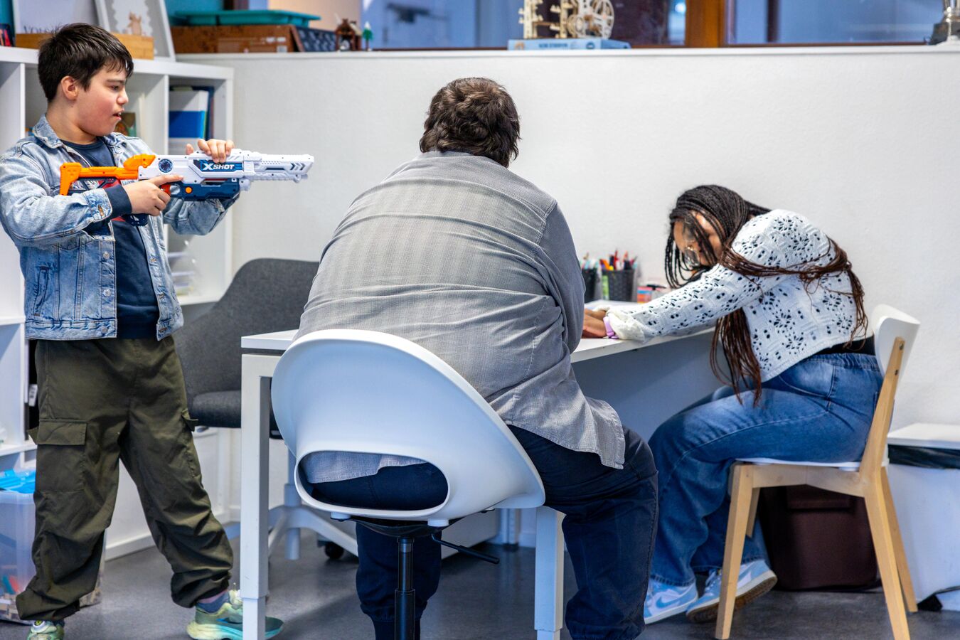 Jasper is stagiair maatschappelijke zorg: ‘Wat ik vaak merk is dat Brucelee het aan het begin van de les nog een beetje moeilijk vindt. Dan heeft hij er niet zoveel zin in. Maar op een gegeven moment geef je hem een situatie en dan ziet hij daar dus ook alweer een soort van leuk spel in. Krijgt Brucelee zo’n twinkeling in zijn ogen, dan gaat hij er eigenlijk helemaal in op. Vandaag schakelde hij gemakkelijk van de ene in de andere situatie. Hij heeft een rijke fantasie.’